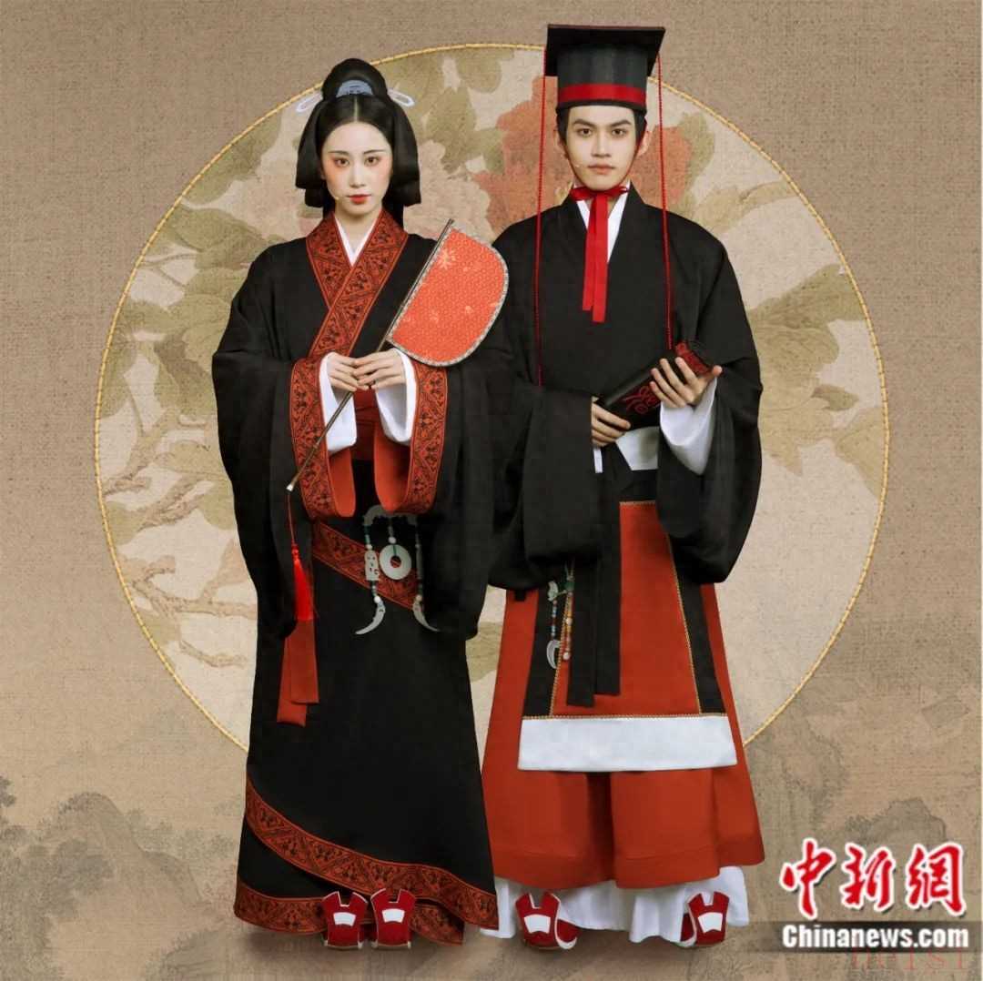 周代婚服色彩遵循“玄(玄黑色)纁(纁紅色)制度”,這在秦漢時期得到充分體現(xiàn)。秦漢時遵“天地玄黃”,人們認(rèn)為黑色代表幽遠(yuǎn)無窮的“天”,所以婚服為玄黑,更顯莊重和尊貴。