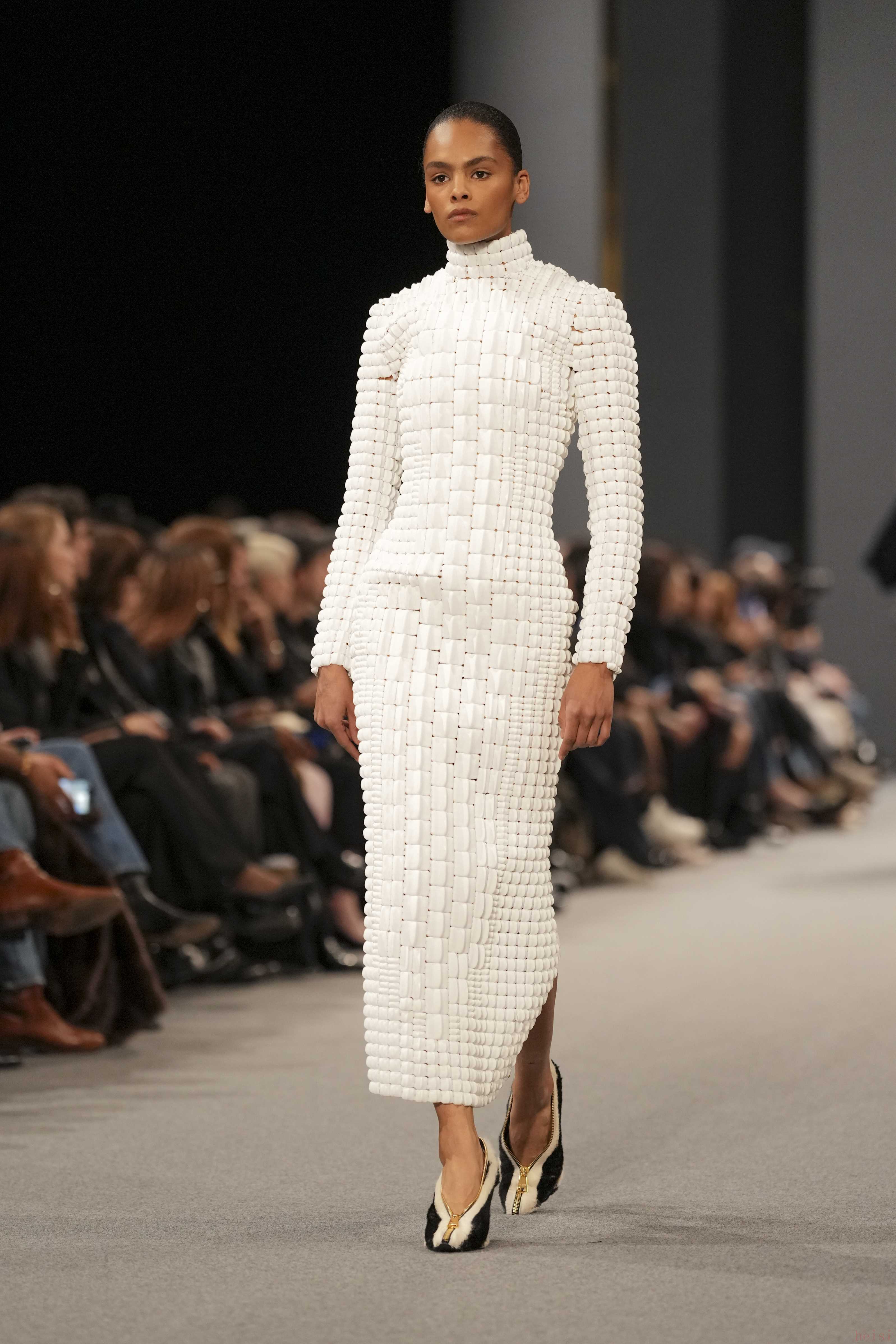 "香奈兒元素的現(xiàn)代演繹:" 設(shè)計(jì)師 Christian Dior (Balmain 創(chuàng)意總監(jiān)) 大量運(yùn)用了香奈兒式的廓形,如經(jīng)典的斜紋軟呢外套、雙排扣、鏈條包等元素,但進(jìn)行了大膽的變形和重組。