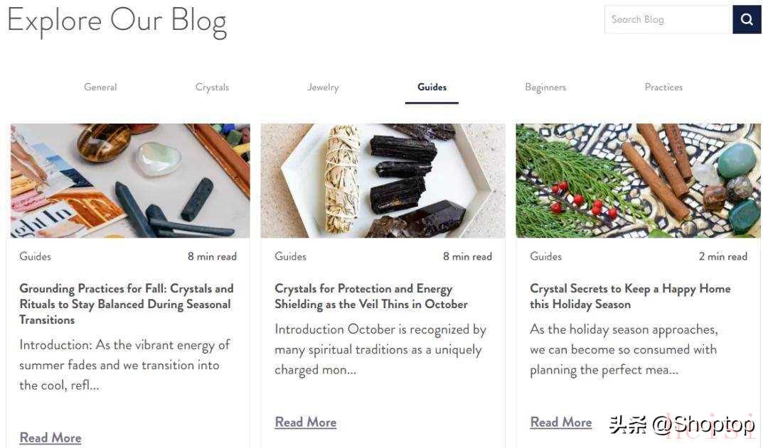 獨(dú)立站內(nèi)專設(shè)博客板塊,通過(guò)發(fā)布水晶選購(gòu)指南、水晶知識(shí)科普、不同顏色水晶含義、水晶如何應(yīng)用于生活等文章,進(jìn)一步強(qiáng)調(diào)水晶與財(cái)運(yùn)、健康等正向能量的關(guān)系,,幫助用戶了解水晶珠寶日常搭配以及為不同節(jié)日或場(chǎng)景下禮物靈感,滿足用戶多樣化需求,大大提高獨(dú)立站轉(zhuǎn)化率。