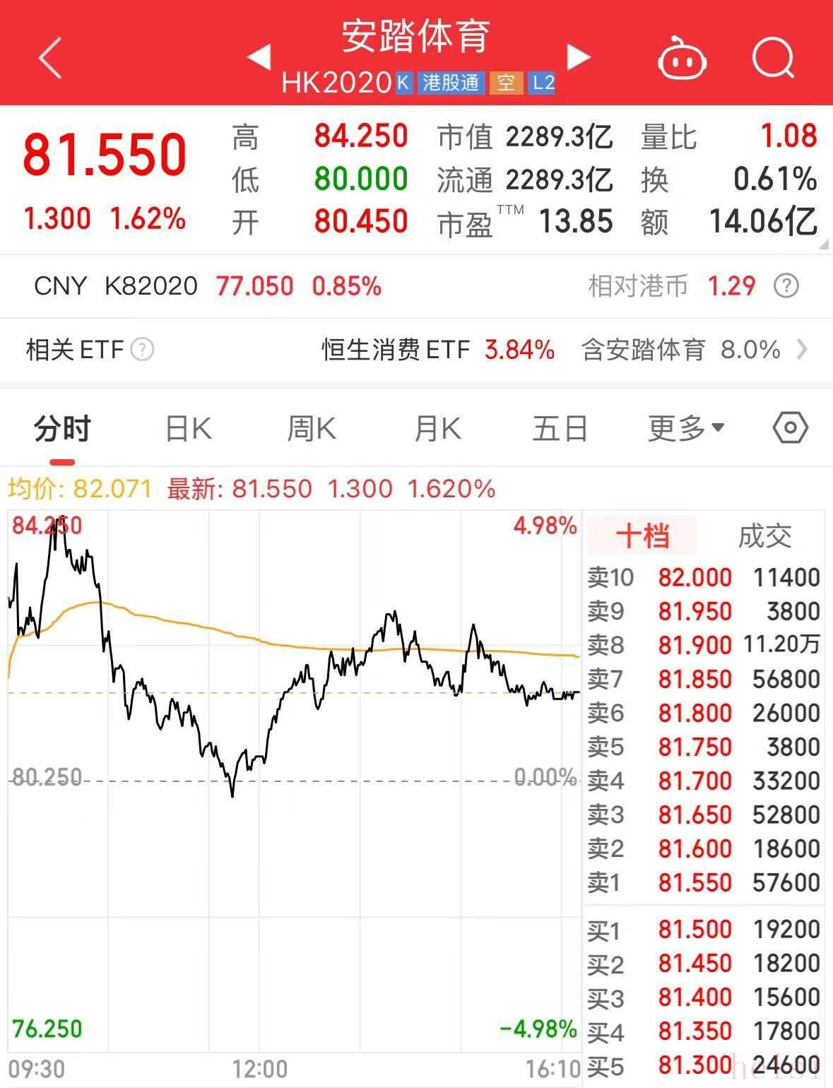 截至4月10日收盤,安踏體育股價(jià)上漲1.62%至81.55港元,市值為2289億港元。