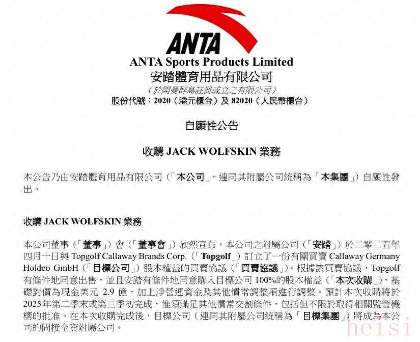 公告稱,附屬公司(安踏)與Topgolf Callaway Brands Corp.(Topgolf)訂立了一份有關(guān)買賣Callaway Germany Holdco GmbH(目標(biāo)公司)股本權(quán)益的買賣協(xié)議。根據(jù)協(xié)議,Topgolf有條件地同意出售,并且安踏有條件地同意購(gòu)入目標(biāo)公司100%的股本權(quán)益,基礎(chǔ)對(duì)價(jià)為現(xiàn)金2.9億美元(約合人民幣21億元),加上凈營(yíng)運(yùn)資金及其他慣常調(diào)整項(xiàng)進(jìn)行調(diào)整。預(yù)計(jì)本次收購(gòu)將于2025年第二季末或第三季初完成。收購(gòu)?fù)瓿珊?,目?biāo)公司將成為公司的間接全資附屬公司。目標(biāo)公司于德國(guó)伊德斯坦因注冊(cè)成立并在全球范圍內(nèi)的目標(biāo)市場(chǎng)經(jīng)營(yíng)戶外服飾、鞋履及裝備品牌Jack Wolfskin(狼爪)業(yè)務(wù)。