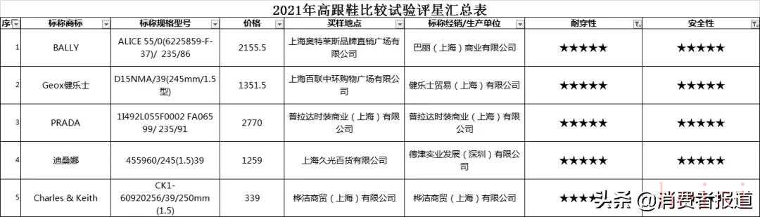 綜合比較試驗結(jié)果,BALLY、Geox健樂士、PRADA、迪桑娜、Charles&Keith 5款表現(xiàn)較好,在安全性以及耐穿性方面均獲得了5星評級。