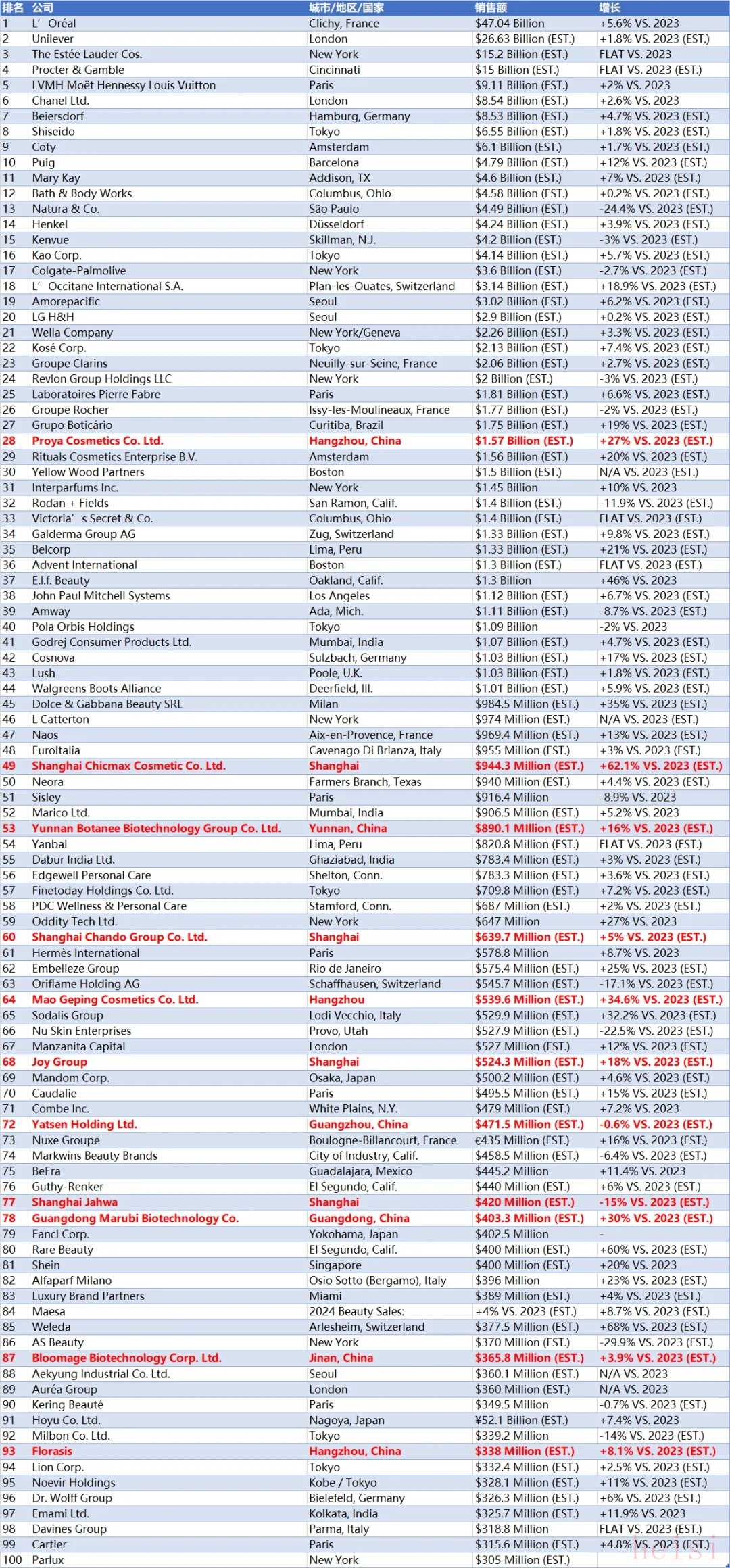其余上榜的中國企業(yè)分別是第53位的貝泰妮、第60位的自然堂、第72位的逸仙電商(完美日記母公司)、第77位的上海家化、第87位的華熙生物、第93位的花西子,分別下降5個(gè)、3個(gè)、4個(gè)、18個(gè)、23個(gè)、15個(gè)名字。