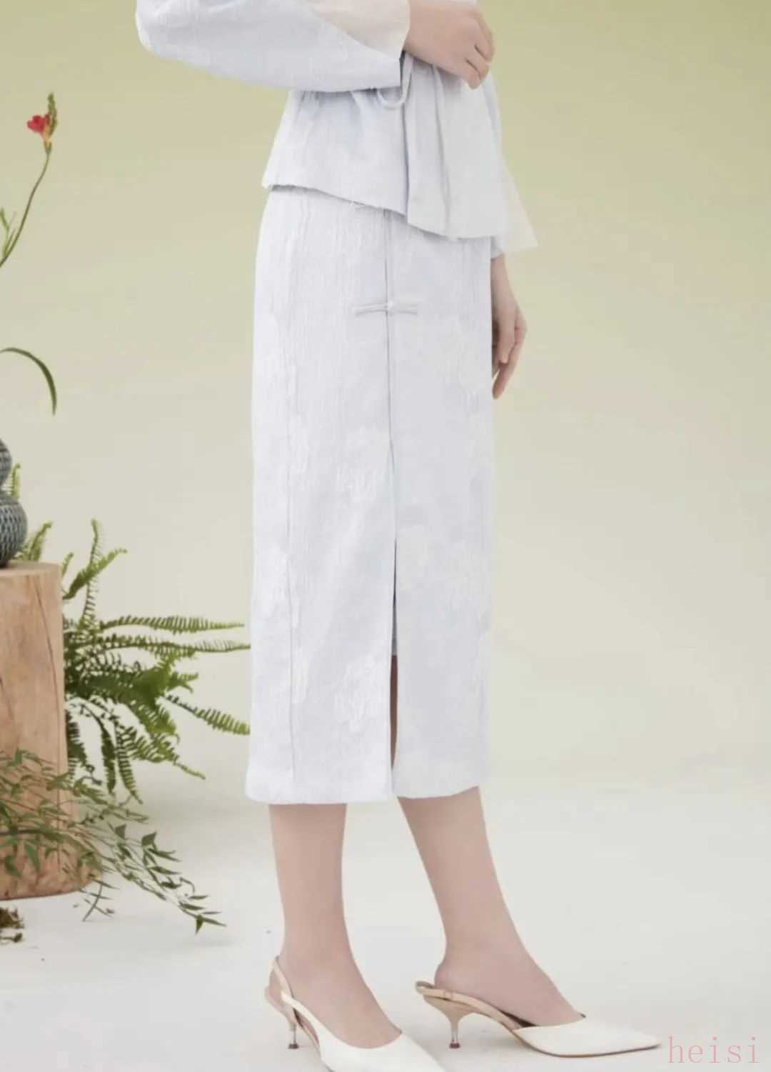 半身裙采用直筒版型、立體剪裁設(shè)計(jì),符合東方古典的優(yōu)雅魅力。圓弧立領(lǐng)腰頭設(shè)計(jì),端莊優(yōu)雅;服飾在細(xì)節(jié)上融入傳統(tǒng)工藝的點(diǎn)綴,賦予了一抹靈動(dòng)浪漫的氣息。
