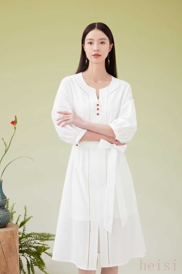 連衣裙采用了天然的天絲面料,上身素雅大氣、輕盈飄逸。中式小圓領(lǐng)弧度圓潤(rùn)、線(xiàn)條流暢;微蓬的燈籠七分長(zhǎng)袖,營(yíng)造出輕盈的“空氣感”。