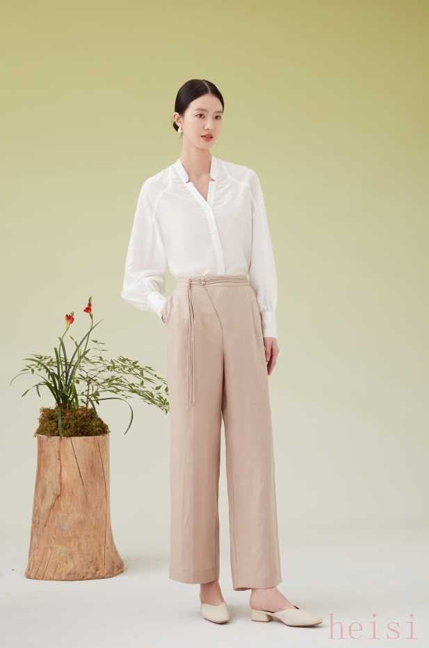 寬邊一字拼接腰設(shè)計(jì),腰頭中式盤(pán)扣+裝飾性流蘇以及斜門(mén)襟風(fēng)格,將中式元素與西式裁剪巧妙兼容,獨(dú)樹(shù)一幟、別具匠心;寬松直筒版型,線(xiàn)條垂順流暢,隨性自在。