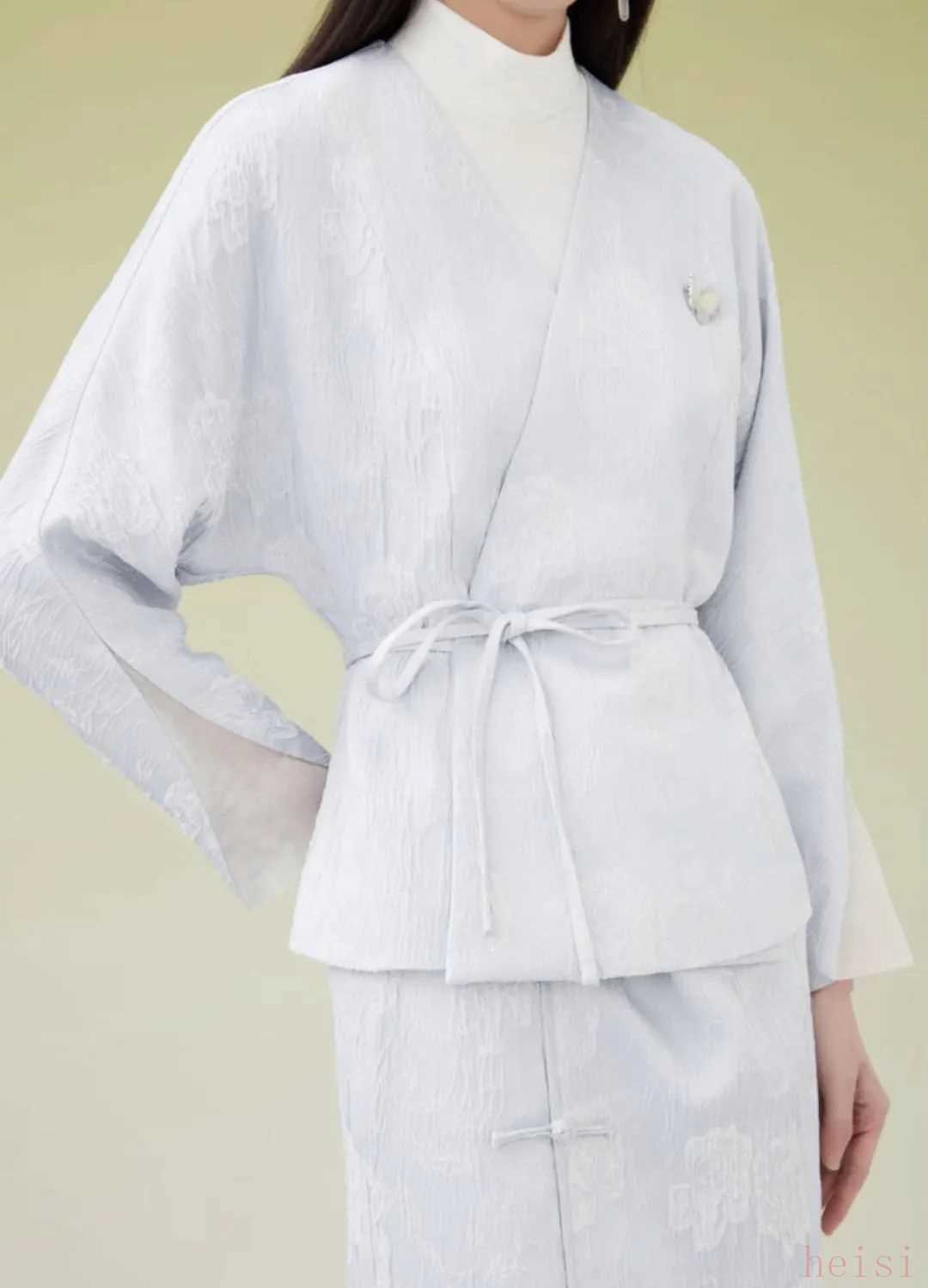 交領(lǐng)斜襟,凸顯出脖頸的修長(zhǎng);腰間系帶設(shè)計(jì),飽含了東方優(yōu)雅的氣韻,完美修飾身材比例;袖口處拼接了三角形真絲歐根紗,淡淡的提花紋理,獨(dú)具一格;兩側(cè)隱藏式口袋設(shè)計(jì),不影響美觀的同時(shí)又能增加服裝的實(shí)用性。