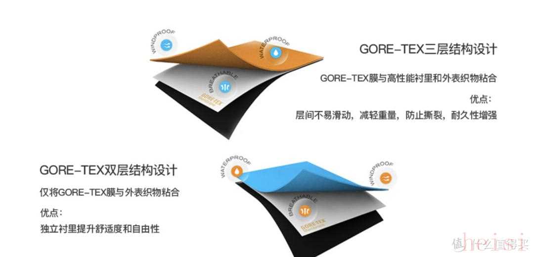 GORE-TEX面料一般都是由2層或3層結(jié)構(gòu),2層結(jié)構(gòu)是將防水透氣薄膜直接于面料粘合在一起,3層面料在防水透氣薄膜內(nèi)側(cè)還有一層內(nèi)襯起到防磨的作用,前者更輕盈透氣,后者更結(jié)實耐穿防水防風性能更好。
