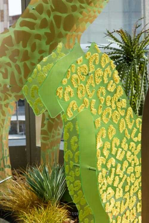 和諧共生·頌贊自然:可持續(xù)時尚藝術(shù)裝置綠洲主題的藝術(shù)裝置生動詮釋自然的多樣性與和諧。雪豹、斑馬、長頸鹿等動物形象與沙漠植物共同營造出一幅充滿生機的微型生態(tài)系統(tǒng),其斑紋和肌理采用可持續(xù)環(huán)保材質(zhì)制作,賦予摩登藝術(shù)獨特魅力,傳遞品牌對于人與自然和諧共生的深刻思考。