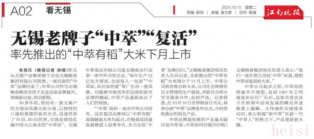 隨著市場(chǎng)競(jìng)爭(zhēng)的加劇和新興品牌的崛起中萃產(chǎn)品逐漸淡出了人們的視線但中萃品牌的力量從未消失幾十年來(lái)它默默積蓄,等待著再次綻放......2024年為響應(yīng)市委市政府關(guān)于加強(qiáng)本土老字號(hào)品牌傳承與創(chuàng)新中萃公司作為無(wú)錫糧食集團(tuán)全資子企業(yè)品牌復(fù)興,煥新出發(fā)再啟新程!“‘中萃’商標(biāo)一直由中萃公司持有。這次復(fù)活品牌將以‘中萃有稻’高端健康大米為起點(diǎn),在糧食高質(zhì)量發(fā)展賽道上奮勇?tīng)?zhēng)先,全力實(shí)現(xiàn)‘中萃’品牌回歸?!睙o(wú)錫糧食集團(tuán)相關(guān)負(fù)責(zé)人表示,全新推出的“中萃有稻”大米預(yù)計(jì)于11月上市。中萃公司將首推吉林大米,公司在吉林擁有自主管理的生產(chǎn)基地,并聯(lián)合吉林大學(xué)全鏈條合作,品控嚴(yán)選。記者獲悉,在10月16日世界糧食日當(dāng)天,將舉辦新“中萃”品牌發(fā)布儀式,介紹首批推出的相關(guān)產(chǎn)品。 中萃品牌最經(jīng)典的產(chǎn)品毫無(wú)疑問(wèn)是中萃面中萃面何時(shí)能回歸呢?無(wú)錫糧食集團(tuán)相關(guān)負(fù)責(zé)人表示“我們一直在努力尋找‘中萃’味道,想把中萃面復(fù)刻給大家?!?/span>