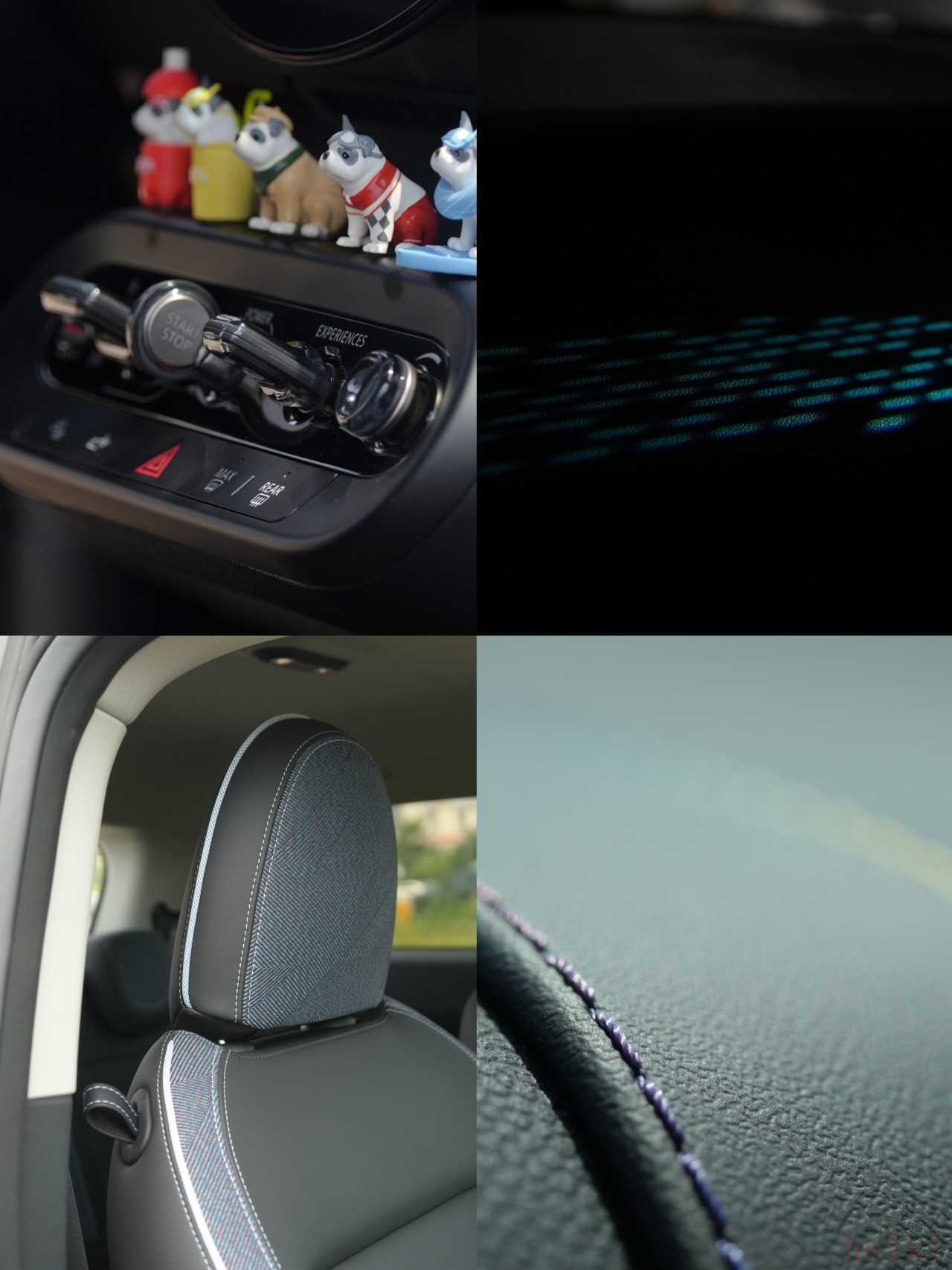 掃過中控臺(tái),經(jīng)典的橢圓形元素?zé)o處不在??照{(diào)出風(fēng)口、門把手卡槽、杯架甚至鑰匙都是橢圓型。還有一些小細(xì)節(jié),比如方向盤下方的條幅也是織物、中控屏兩側(cè)有兩個(gè)小投影可以投射出氛圍光、彩色縫線、拼接材質(zhì)座椅等等,有時(shí)候,也還是需要一些些“情懷”的吧。