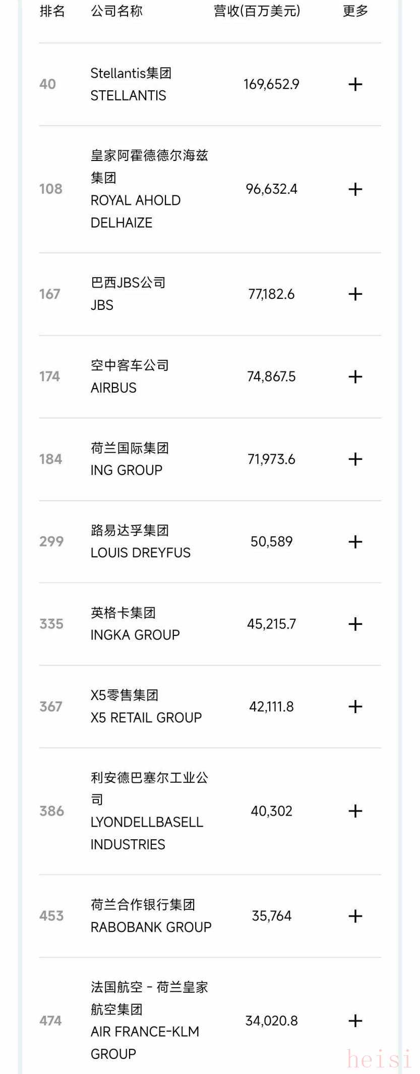 那么,荷蘭呢?它也有12家公司上榜,真巧。其中有5家公司進入了榜單的前200名,說明它們規(guī)模很大。比如Stellantis集團,這是一個汽車制造巨頭;還有空中客車,就是那個造飛機的公司。喜力公司、荷蘭國際集團、荷蘭合作銀行也都在名單上,涉及了不同行業(yè),從汽車、航空到啤酒和金融服務(wù)。