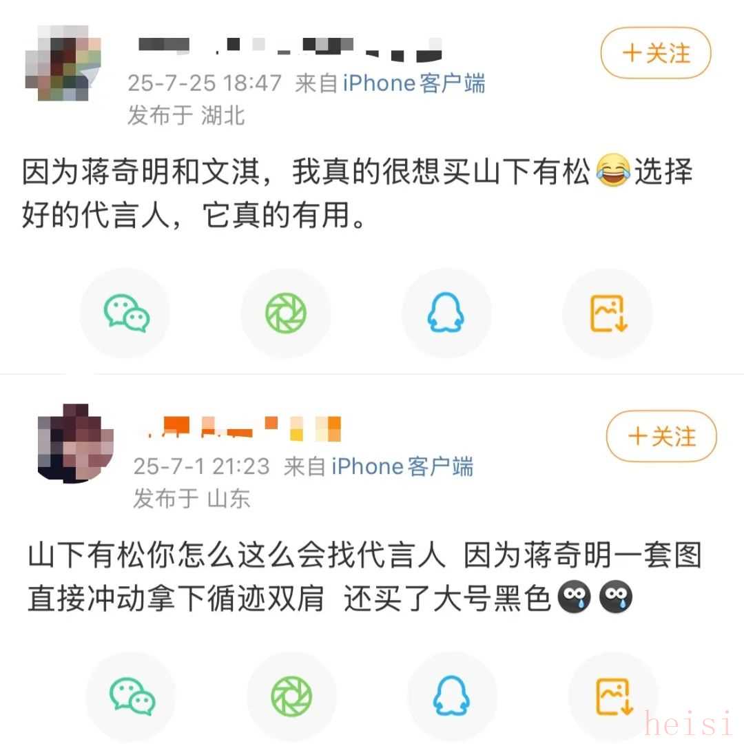 在影視圈不同領(lǐng)域活躍的代言人,也觸達(dá)到不同的粉絲受眾,讓不少網(wǎng)友發(fā)博感嘆:“代言人太會(huì)選”“因?yàn)槭Y奇明和文琪,真的很想買(mǎi)山下有松?!?/span>