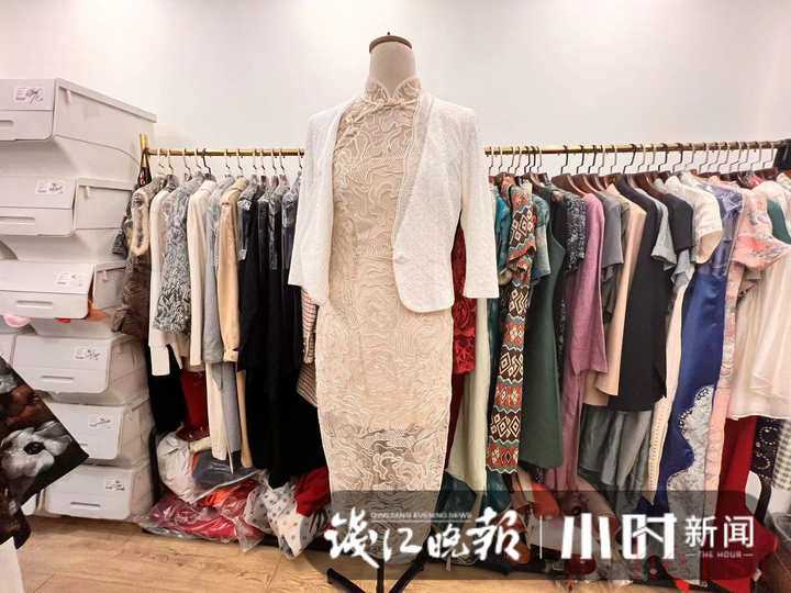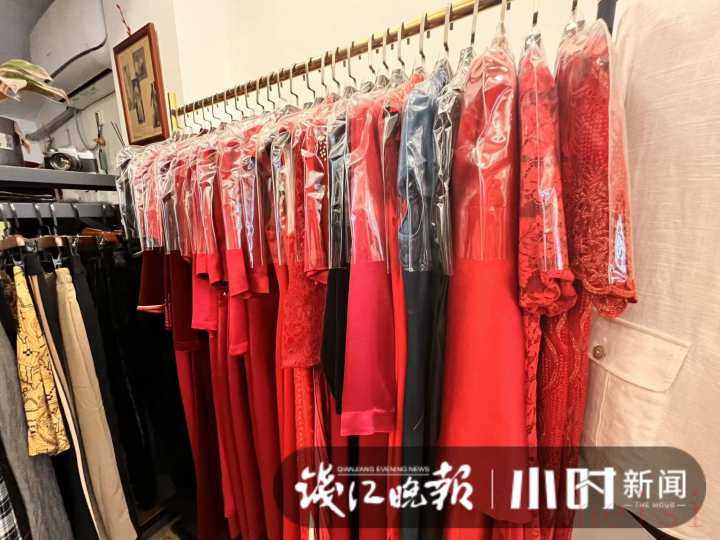 無疑,旗袍最亮眼?;ㄉ邮胶芏?,右手側(cè)專門還有一排喜慶的紅色旗袍,顯然是新娘的婚禮穿著。