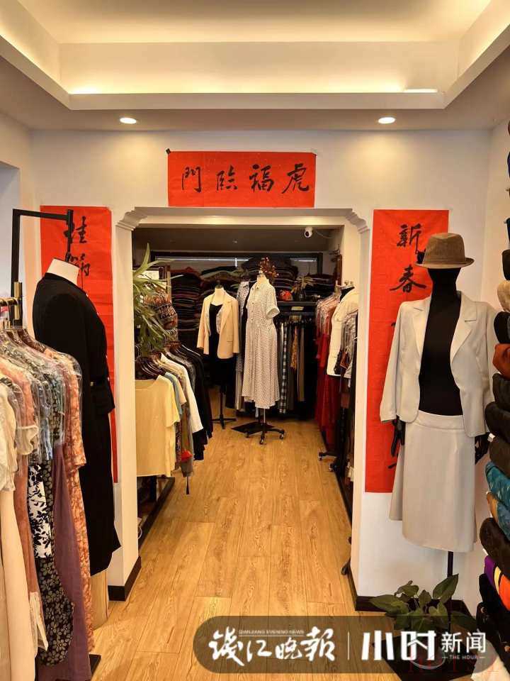 面料墻邊的裝飾墻上還貼著紅色對(duì)聯(lián),跟周邊的衣服交映在一起,透著那么一股子喜慶。