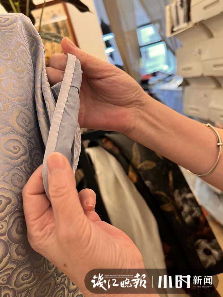 廖阿姨翻開胳膊處的包邊,“這些位置都是要用手工一針針去縫的,針距在0.3公分,要包得很平整,這都是經(jīng)驗(yàn)?!?/p>