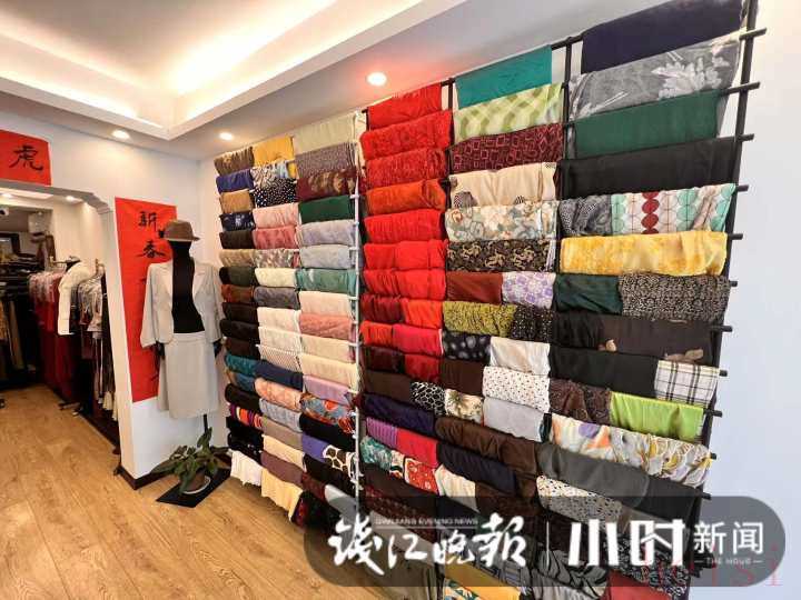 一進(jìn)店門,右手邊是面料墻,近百種花色和材質(zhì)的面料擺放在架子上。