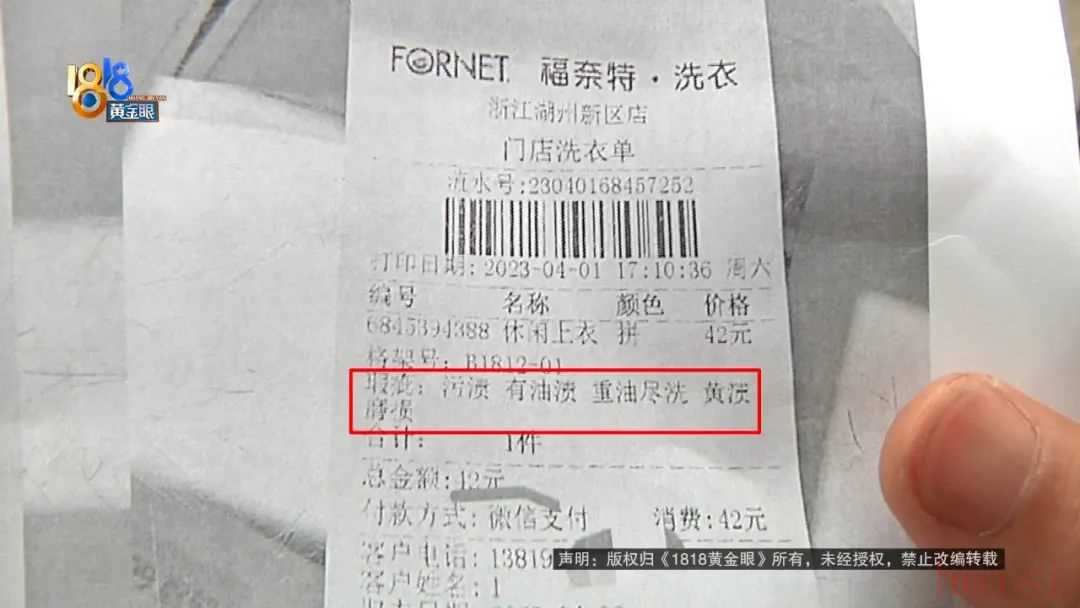 當時,店家和她一起,把衣服送到了福奈特洗衣湖州龍溪北路店。郭女士:我4月10號過來取,本來想取走,后來一看這件衣服,一個是這個標洗沒了,一個是串色的問題。