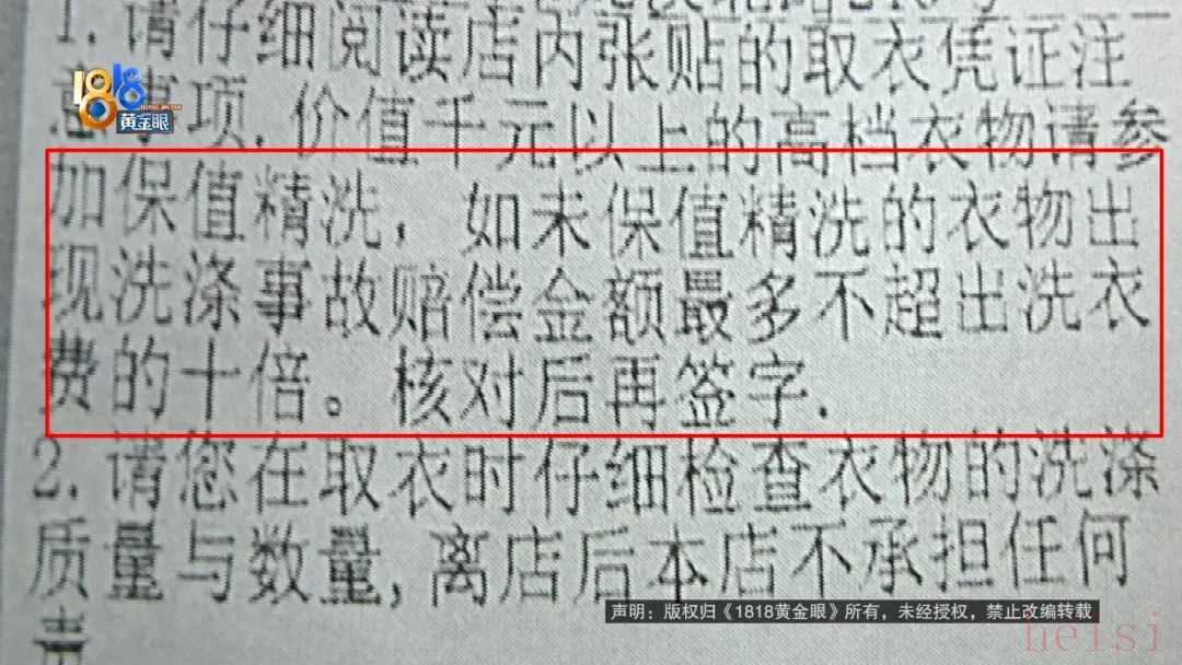 上面還寫著“如未保值精洗的衣服,出現(xiàn)洗滌事故,賠償金額最多不超出洗衣費的十倍”,所以她又讓烤肉店多付了兩百塊錢。