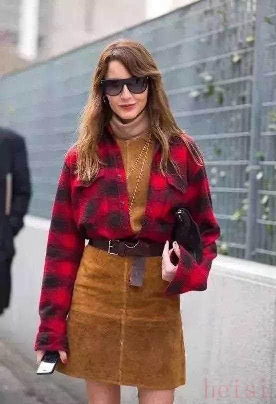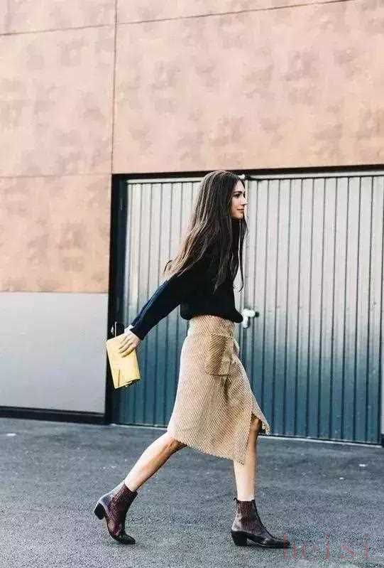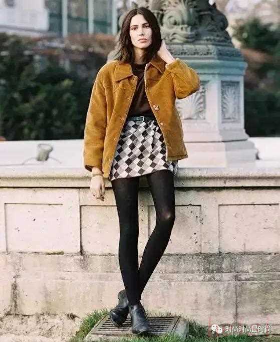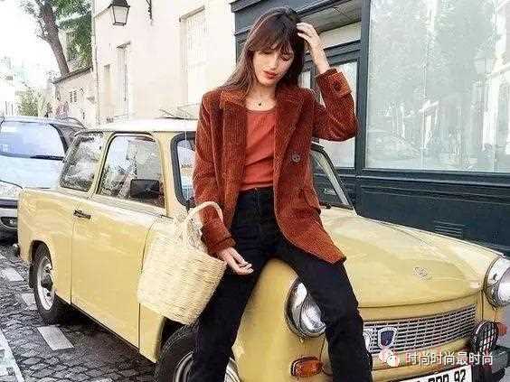 也有下面這種,利用燈芯絨顏色的質(zhì)感與性感的小黑裙搭配,彰顯出超高的穿搭品味的。
