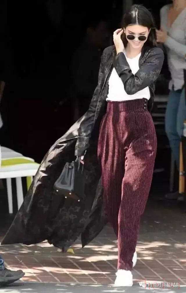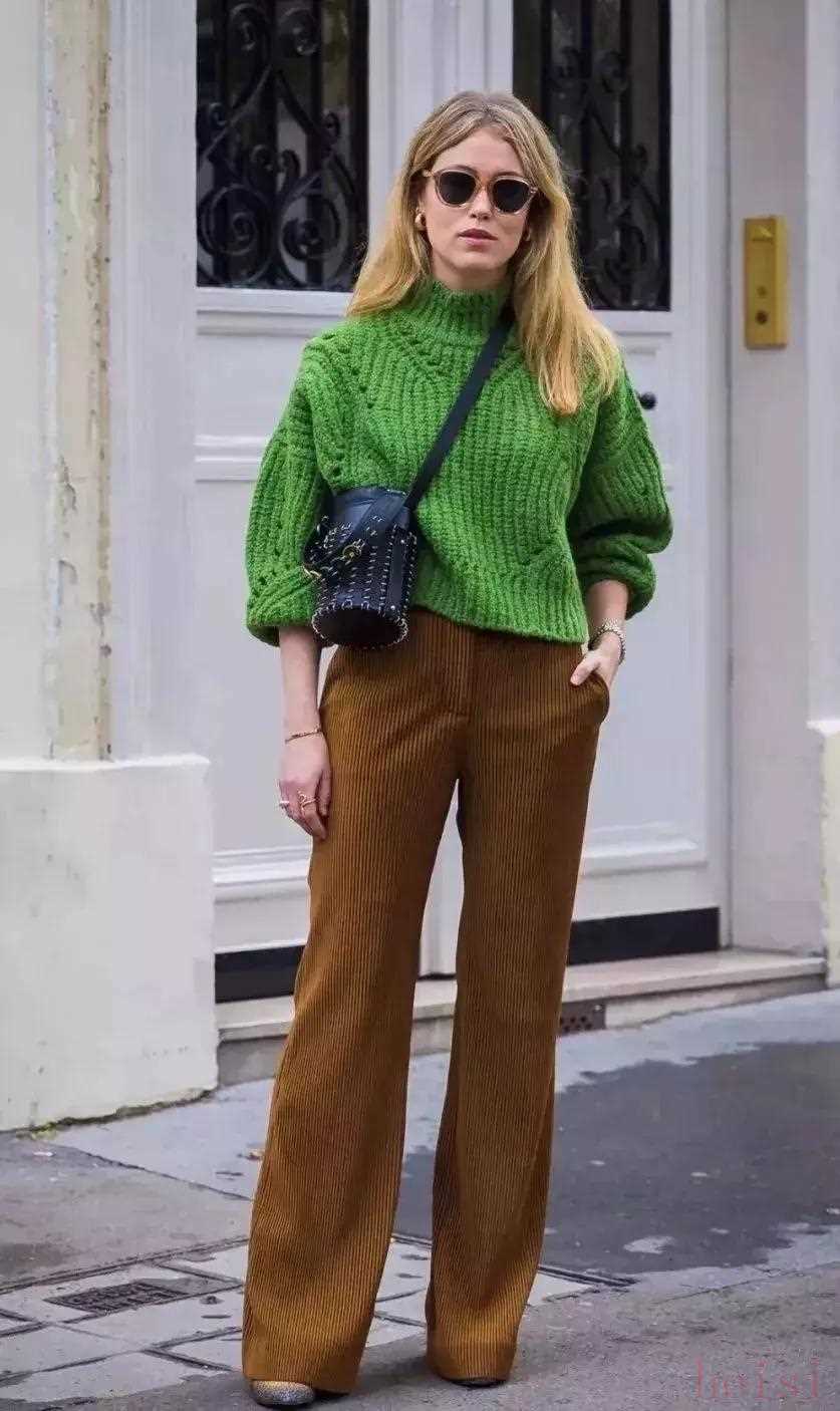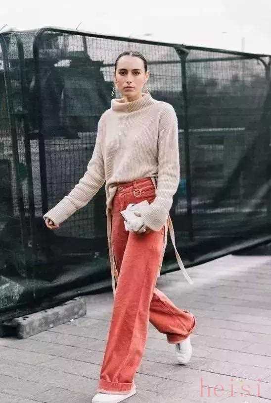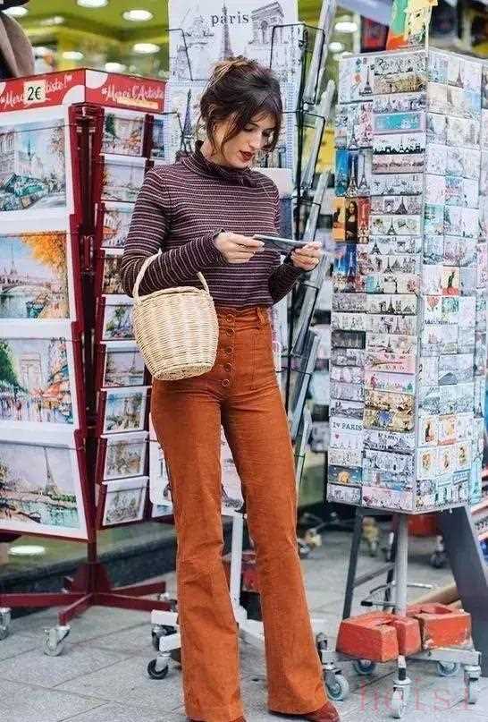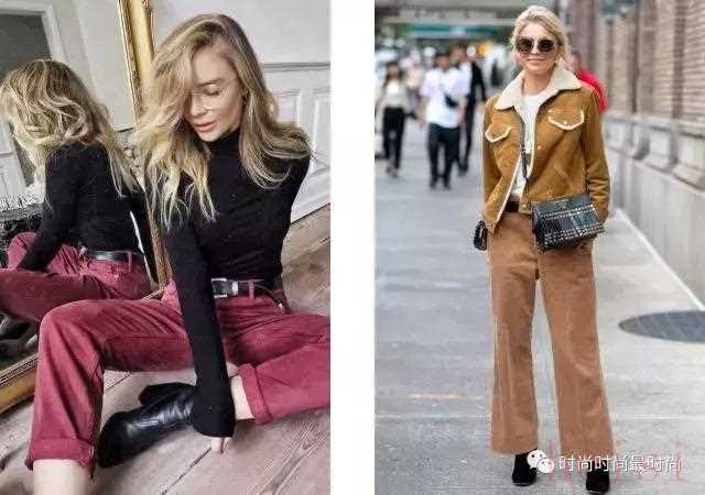 "高腰直筒/闊腿燈芯絨褲":顯高顯瘦,自帶復(fù)古摩登感,搭配簡單的上衣就很出彩。