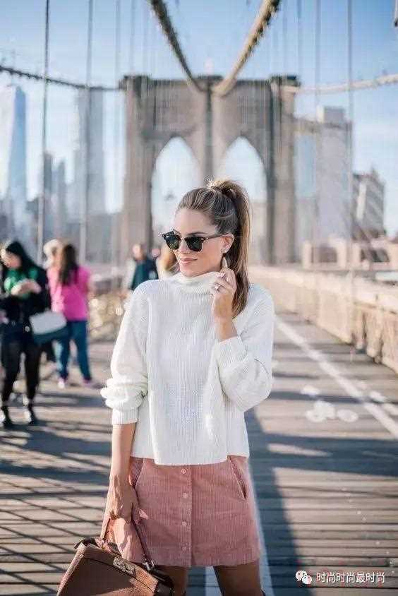 白色毛衣搭配修身燈芯絨半裙,清新又復(fù)古。