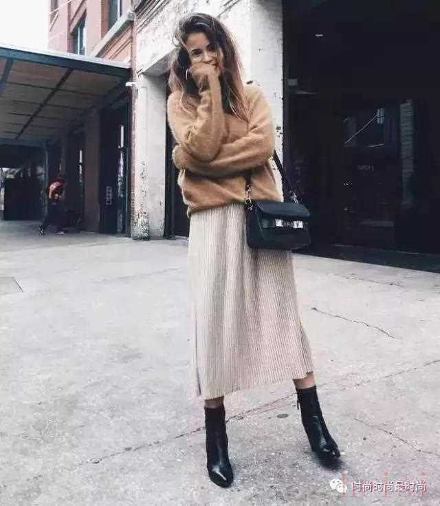 卡其米色燈芯絨過膝裙搭配咖色羊絨上衣,保暖的同時,又生動精致。