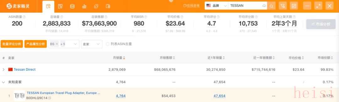 亞馬遜:霸榜細(xì)分類(lèi)目榜單7年在亞馬遜美國(guó)站,Tessan正在用一款插頭適配器,重新定義“品牌護(hù)城河”的邊界。我們以Tessan品牌下的200個(gè)ASIN在30天內(nèi)表現(xiàn)作為研究對(duì)象,以賣(mài)家精靈sellersprite數(shù)據(jù)顯示,其店鋪“Tessan Direct”的預(yù)估月銷(xiāo)量287.9萬(wàn)單,對(duì)應(yīng)的預(yù)估月銷(xiāo)售額約6806.6萬(wàn)美金。(該數(shù)據(jù)為算法推算,實(shí)際銷(xiāo)量或受新品上架、活動(dòng)節(jié)奏等因素影響而波動(dòng)。)