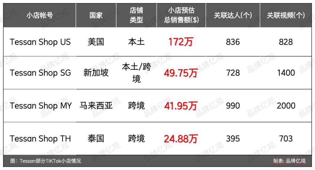 而作為美國(guó)的“外延市場(chǎng)”,新加坡(49.75萬(wàn)美元)、馬來(lái)西亞(41.95萬(wàn)美元)、泰國(guó)(24.88萬(wàn)美元)這幾個(gè)小店的體量相對(duì)較小,銷(xiāo)量相對(duì)分散,但也各有打法。從達(dá)人和視頻數(shù)量來(lái)看,Tessan并不是在做一刀切。其美國(guó)小店的打法比較重,836個(gè)達(dá)人和828條視頻,人均產(chǎn)出1條視頻,其重點(diǎn)綁定的對(duì)象可能集中在頭部和腰部達(dá)人。而馬來(lái)西亞小店則是典型的廣撒網(wǎng)模式,990個(gè)達(dá)人,2000條視頻,人均2條,通過(guò)知名度沒(méi)那么高的達(dá)人,反復(fù)地掛產(chǎn)品卡。相比之下,泰國(guó)小店的達(dá)人和視頻數(shù)量適中,表現(xiàn)中規(guī)中矩。(文/品牌億觀)備注:部分?jǐn)?shù)據(jù)資料來(lái)自第三方,僅供行業(yè)參考。