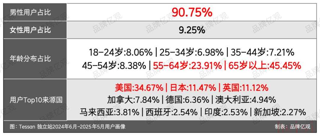 在付費(fèi)搜索方面,Tessan沒(méi)有盲目的燒廣告,而是有選擇地加碼搜索關(guān)鍵詞,比如“GaN旅行適配器”“美規(guī)插頭轉(zhuǎn)換器”等。其付費(fèi)搜索占比18.05%,略低于iBlockCube的22.5%,而明顯高于SlimQ(10.51%)。從Tessan的用戶畫(huà)像來(lái)看,這個(gè)看似“小工具”類(lèi)的電源品牌,吸引了一群以“銀發(fā)男”為主的用戶,且多數(shù)來(lái)自美日英等發(fā)達(dá)市場(chǎng)。其男性用戶占比達(dá)90.75%,年齡在55歲以上的占比近70%,而女性用戶占比僅9.25%。