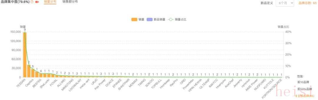 過(guò)去6個(gè)月內(nèi),這個(gè)細(xì)分類(lèi)目下,共有65個(gè)品牌在賽跑,品牌集中度達(dá)79.6%。但Tessan一個(gè)品牌的月銷(xiāo)量(近15萬(wàn)單),就已經(jīng)遠(yuǎn)遠(yuǎn)甩開(kāi)了后面整整一長(zhǎng)串對(duì)手,幾乎是Ceptics、BESTEK、SheLucki等品牌的總和。這不再是第一名和第二名的差距,幾乎是“一個(gè)品牌撐起了整個(gè)細(xì)分類(lèi)目”的局面。