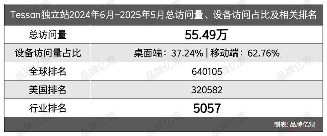 03.獨(dú)立站:Tessan很佛系,銀發(fā)族是主要用戶Tessan獨(dú)立站的總體流量并不高。過(guò)去一年(2024年6月—2025年5月),其獨(dú)立站的總訪問(wèn)量?jī)H為55.49萬(wàn),折算下來(lái),月均訪問(wèn)量不到4.6萬(wàn)。