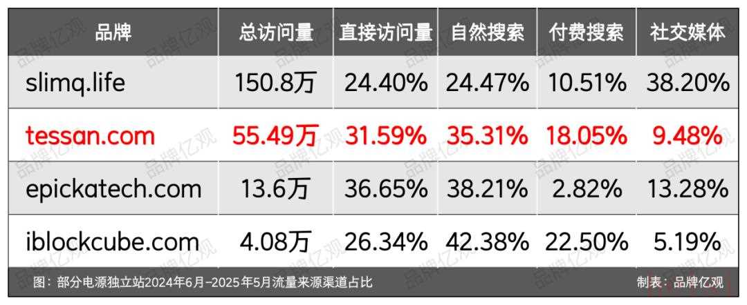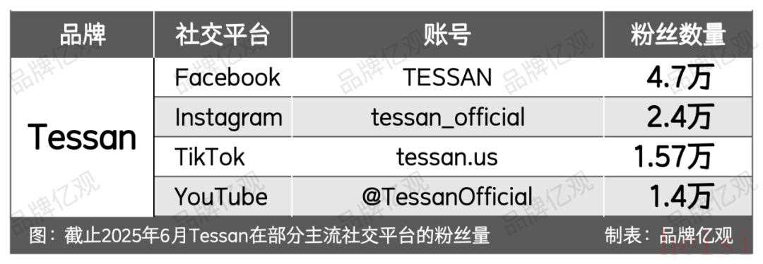 值得注意的是,Tessan的用戶中,近六成來(lái)自美國(guó)(34.67%)、日本(11.47%)、英國(guó)(11.12%)。這三個(gè)國(guó)家都有一個(gè)共同點(diǎn):老年用戶多、旅游出境頻繁、電源標(biāo)準(zhǔn)復(fù)雜,尤其是美國(guó),既是充電標(biāo)準(zhǔn)復(fù)雜的主場(chǎng),又是銀發(fā)族互聯(lián)網(wǎng)使用比例最高的國(guó)家之一。這些老年消費(fèi)者在出國(guó)旅行中,經(jīng)常需要攜帶多個(gè)國(guó)家的轉(zhuǎn)換插頭,非常耗費(fèi)精力和金錢(qián)。然而,他們的消費(fèi)觀念不像年輕人那樣,習(xí)慣在社交媒體上沖動(dòng)下單,而是更講究功能、兼容性、安全性和品牌背書(shū)等,至于那些連“說(shuō)明書(shū)都寫(xiě)得不清不楚”的產(chǎn)品,早就被他們列入了黑名單。而TESSAN主打的旅行電源適配器,正好踩中這一人群的痛點(diǎn)。整體來(lái)看,Tessan目前并未將獨(dú)立站,作為主要營(yíng)收渠道來(lái)運(yùn)營(yíng),而更像是一個(gè)“產(chǎn)品展示櫥窗”或“跳轉(zhuǎn)的中轉(zhuǎn)站”。04.社交媒體:不追粉、不刷量,用YouTube撬開(kāi)獨(dú)立站轉(zhuǎn)化口子社交媒體為T(mén)essan獨(dú)立站,貢獻(xiàn)了9.48%的流量占比,然而,其在社交媒體的整體粉絲體量并不大。「品牌億觀」觀察到,截至2025年6月,其在Facebook、Instagram、TikTok和YouTube,這幾個(gè)主流社交媒體平臺(tái)的粉絲總量剛剛超過(guò)10萬(wàn)。