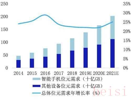 在NAND Flash方面,相較于NOR Flash市場(chǎng),它的市場(chǎng)規(guī)模要大得多,而且還在不斷地增長(zhǎng)。有數(shù)據(jù)表明,NAND Flash市場(chǎng)規(guī)模約占存儲(chǔ)器市場(chǎng)42%,2011年~2016年NAND Flash需求成長(zhǎng)量的年復(fù)合增長(zhǎng)率高達(dá)47%,而受益于3D-NAND Flash的制程加速升級(jí),以及SSD滲透率的不斷提升,NAND Flash的需求量仍將維持強(qiáng)勁的增長(zhǎng)態(tài)勢(shì)。