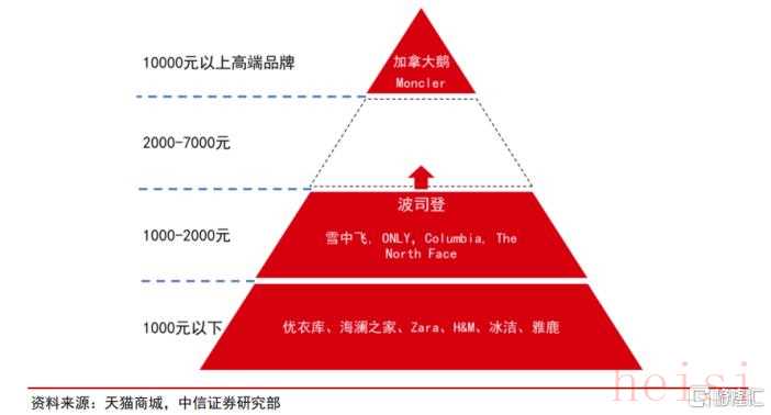 此外,按價(jià)格段劃分,中國(guó)羽絨服市場(chǎng)包含三大類玩家,1)以加拿大鵝、Moncler 為代表,占據(jù)高價(jià)格帶的海外高端羽絨品牌;2)以優(yōu)衣庫(kù)、Zara、HM為代表的快時(shí)尚品牌,以及冰潔、雅鹿等卡位大眾市場(chǎng)的專業(yè)羽絨服品牌;2)波司登、雪中飛等專業(yè)羽絨服品牌,以及ONLY、The North等卡位中高端市場(chǎng)的其他品牌。