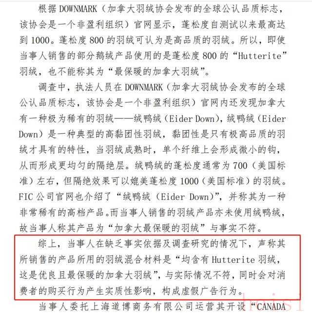 上海市黃浦區(qū)市場(chǎng)監(jiān)督管理局認(rèn)為,就當(dāng)事人銷售的產(chǎn)品所使用的羽絨橫向?qū)Ρ葋?lái)看,當(dāng)事人以偏概全地稱其產(chǎn)品所使用的羽絨“均含有Hutterite羽絨,這是優(yōu)良且最保暖的加拿大羽絨”與事實(shí)不符。