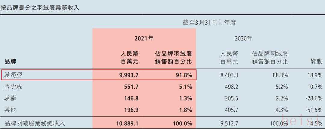 根據(jù)波司登淘寶旗艦店,目前波司登的羽絨服大多在1000-3000元區(qū)間。根據(jù)財(cái)報(bào)數(shù)據(jù),在2020/2021財(cái)年,波司登品牌羽絨服在線銷售收入中,單價(jià)超過(guò)人民幣1800元的銷售收入占比達(dá)到31.8%,同比提升4.3個(gè)百分點(diǎn)。