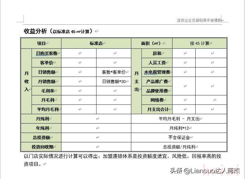 收益分析(以標(biāo)準(zhǔn)店45㎡計(jì)算)