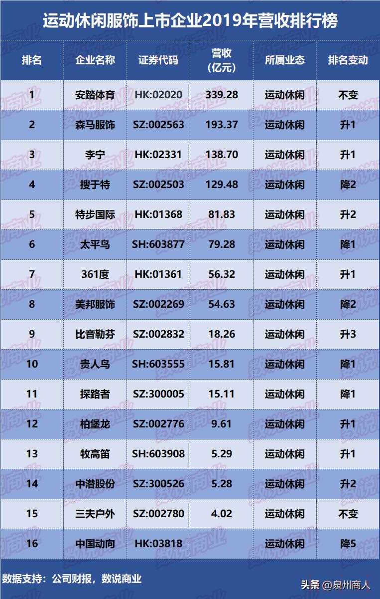 運(yùn)動(dòng)休閑服飾上市企業(yè)2019年?duì)I收排名