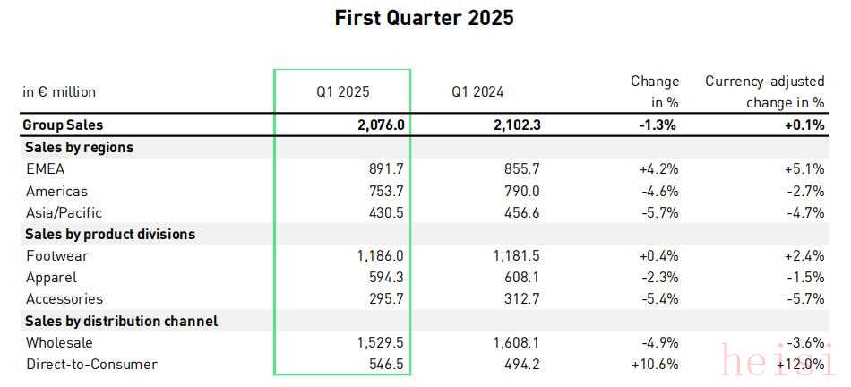 2025年第一季度,彪馬在亞太地區(qū)銷售額下降4.7%至4.31億歐元,公司表示,這反映了大中華區(qū)的持續(xù)疲軟;美洲地區(qū)銷售額下降2.7%至7.54億歐元,公司表示,雖有拉丁美洲實(shí)現(xiàn)兩位數(shù)增長(zhǎng),但北美地區(qū)拖了后腿。