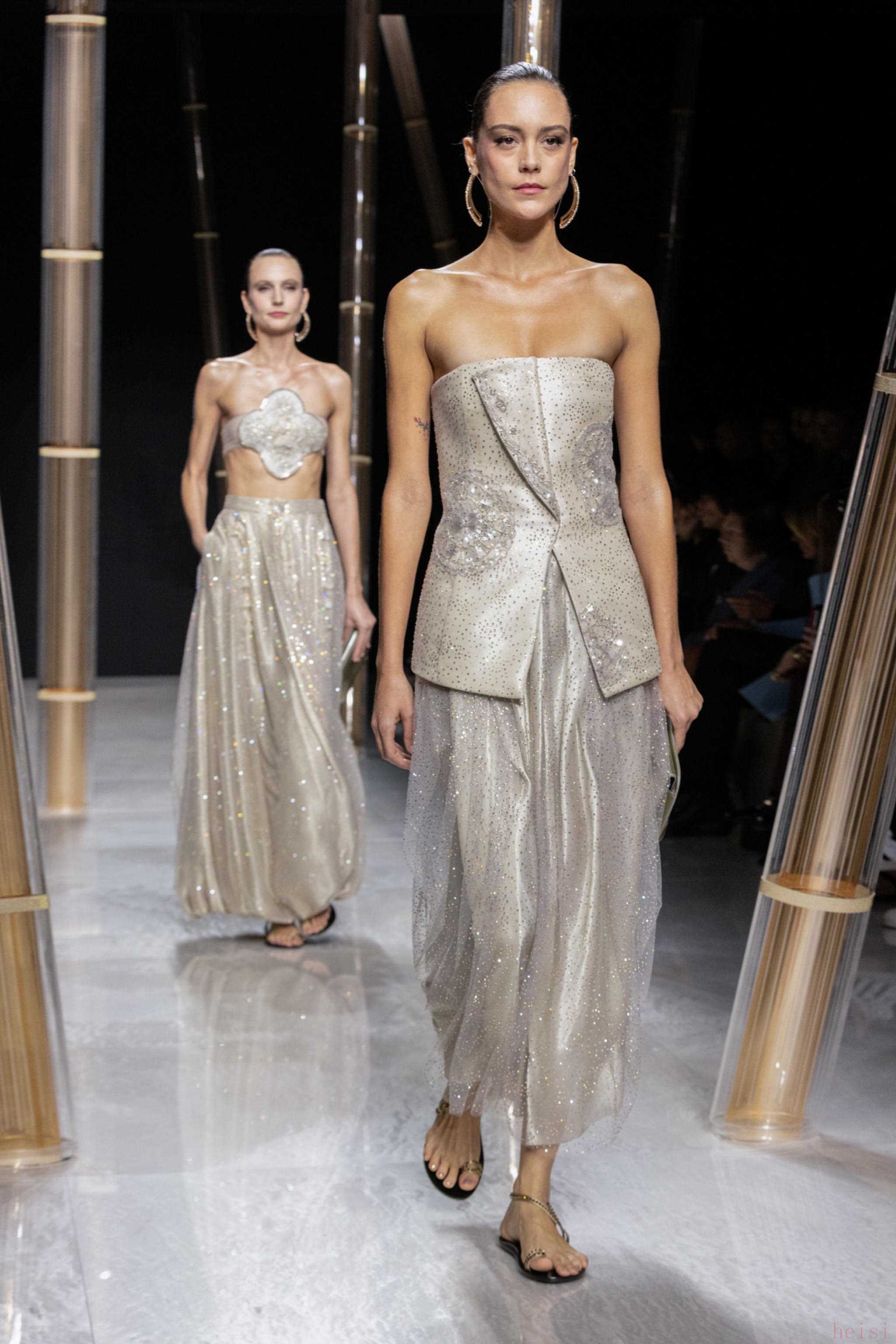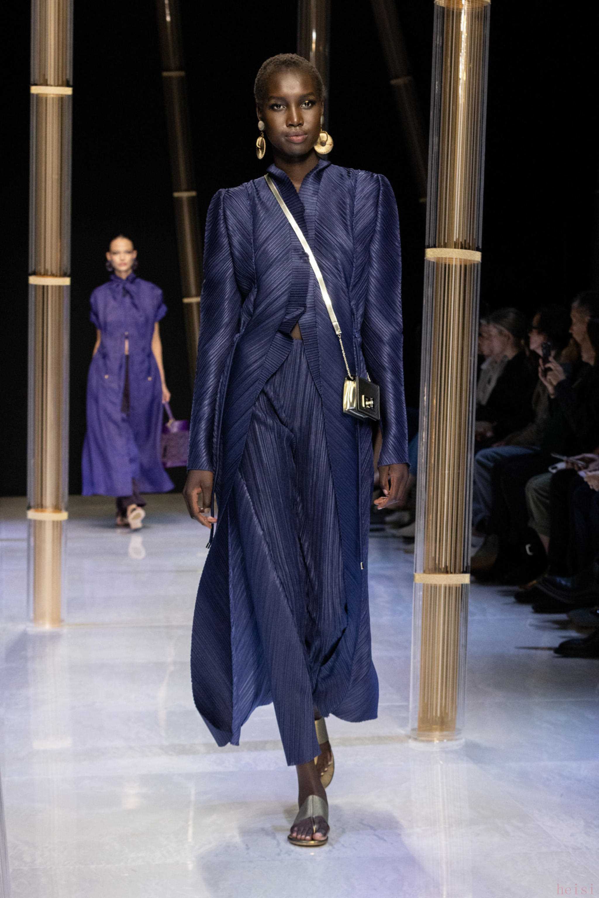 "可持續(xù)時尚:" 阿瑪尼一直積極擁抱可持續(xù)實踐,近年來秀場常強調(diào)環(huán)保理念,如使用回收材料、優(yōu)化生產(chǎn)流程等,并將其融入設(shè)計敘事中。