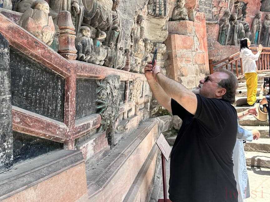 意大利設(shè)計(jì)師卡洛考察大足石刻。受訪單位供圖