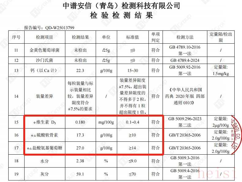 實測數(shù)據(jù)遠超國標,透明配方實力說話:第三方權威檢測報告揭示強貝冠的硬核內涵:每100g產品中,氨糖(以鹽酸氨基葡萄糖計)含量高達27g,硫酸軟骨素達17.3g,維生素D3含量為0.18mg。這一數(shù)據(jù)遠超行業(yè)標準值50%以上!
