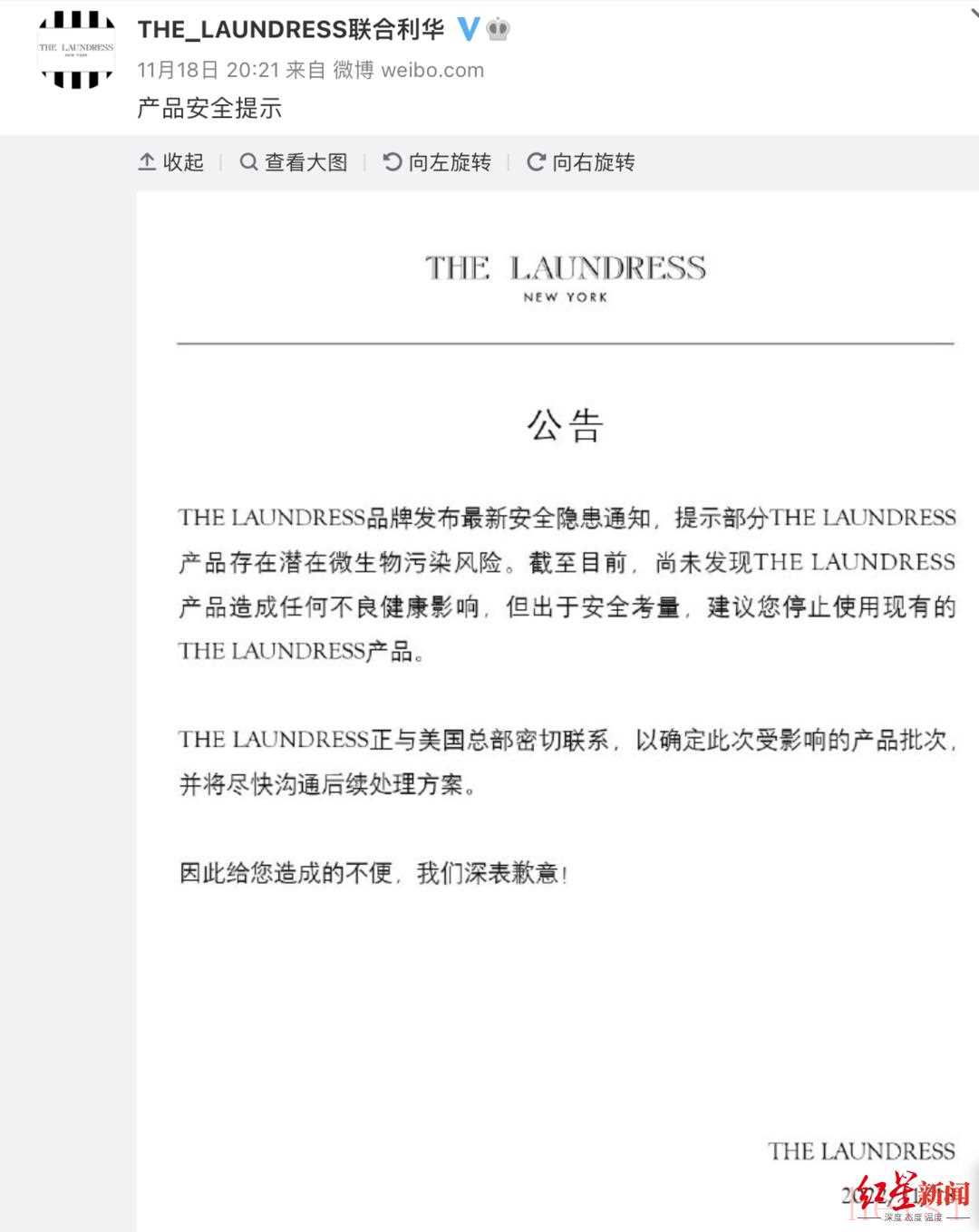 11月18日,THE LAUNDRESS在其官方微博發(fā)布安全隱患通知,部分產(chǎn)品存在潛在微生物污染風(fēng)險(xiǎn)。截至目前,尚未發(fā)現(xiàn)產(chǎn)品造成任何不良健康影響,但出于安全考量,建議停止使用現(xiàn)有的THE LAUNDRESS產(chǎn)品。品牌正與美國(guó)總部密切聯(lián)系,以確定此次受影響的產(chǎn)品批次并將盡快溝通后續(xù)處理方案。