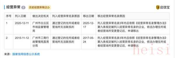 2015年11月12日,廣州薇蜜可思服飾有限公司被廣州市因“通過登記的住所或者經(jīng)營場所無法聯(lián)系”被列入經(jīng)營異常名錄,作出決定機(jī)關(guān)為廣州市工商行政管理局荔灣分局,直到2017年5月24日才被移出經(jīng)營異常名錄。