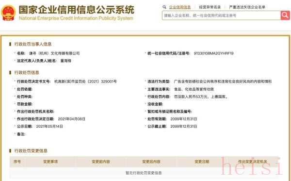 國家企業(yè)信用信息公示系統(tǒng)顯示,該公司處罰事由為“廣告含有妨礙社會公共秩序和違背社會良好風(fēng)尚的內(nèi)容和情形”。主要違法事實(shí)為“食品、化妝品等宣傳功效”,行政處罰內(nèi)容為“罰沒款人民幣53萬元,上繳國庫”,作出行政處罰決定日期為2021年4月8日。