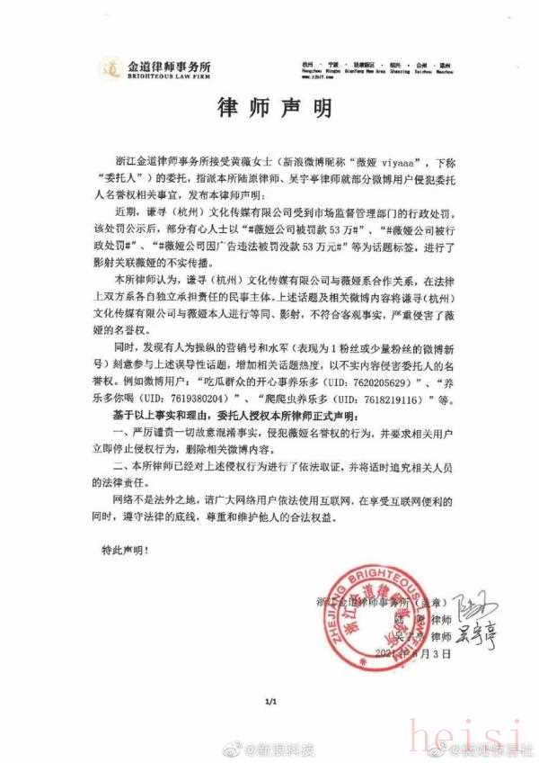 就網(wǎng)傳“薇婭公司被行政處罰”一事,薇婭律師聲明稱,謙尋文化與薇婭系合作關(guān)系,在法律上雙方系各自獨(dú)立承擔(dān)責(zé)任的民事主體?!稗眿I公司被行政處罰”等內(nèi)容將謙尋(杭州)文化傳媒有限公司與薇婭本人進(jìn)行等同、影射,不符合客觀事實(shí)。部分網(wǎng)絡(luò)媒體將兩者混淆對薇婭本人造成名譽(yù)權(quán)侵害。