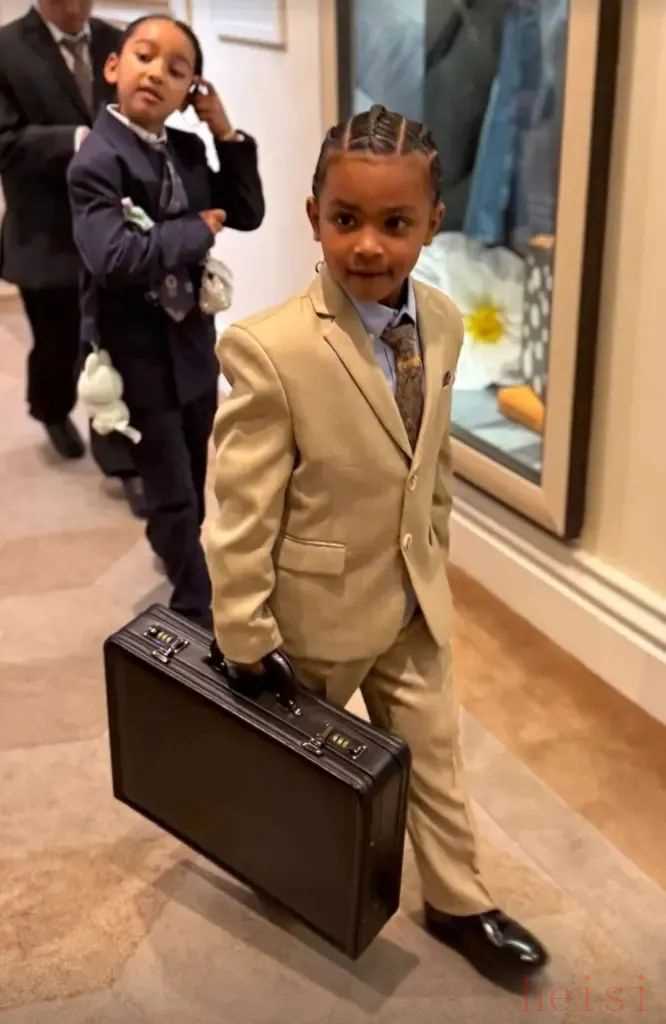 在金姐的慶祝活動(dòng)上,她6歲的兒子還穿了一身西服、拿著手提包,模仿外公。