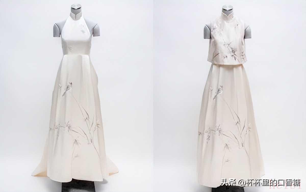Summer的新中式結(jié)婚禮服同樣采用兩件式設(shè)計,外搭中式經(jīng)典立領(lǐng)背心上衣,內(nèi)搭則為一襲削肩旗袍式禮服,巧妙地突破傳統(tǒng)中式的廓形設(shè)計。 大膽削肩與露背剪裁,將率性與柔媚完美融合,展現(xiàn)出新娘自信且獨特的魅力。 在Summer搖曳的裙擺擺動間,盡展出裙身栩栩如真的喜鵲刺繡,別于男士禮服,增添數(shù)朵象征高雅、美好的蘭花圖騰。 此外,整體禮服的輪廓以西式60年代裙身打折為靈感,恰好的裙襬長度,與恰巧的打折澎度,完美恣意出Summer獨樹一幟的風(fēng)格。