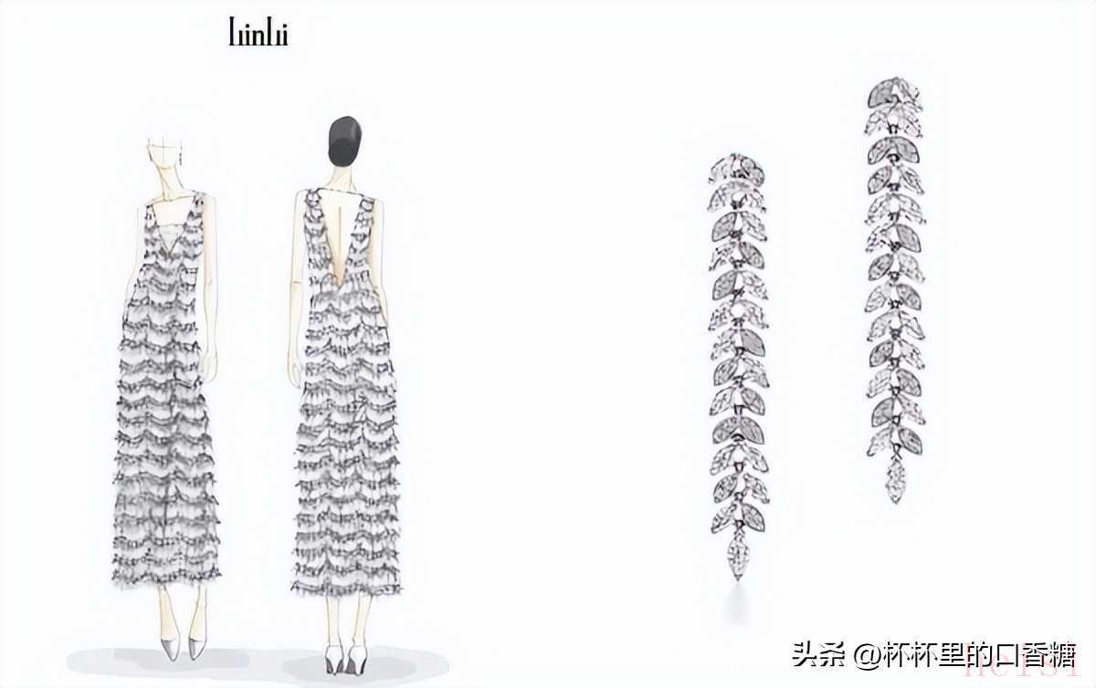 新娘Summer第一套迎賓禮服采用法國頂級蕾絲品牌Sostiss面料,頂級法國蕾絲上頭手工縫制鴕鳥毛剪成的羽絨感,加上施華洛世奇最細的鉆煉進行排列,構(gòu)成帶有律動感的流蘇,在燈光照射下,自帶星光。 前后深V,直身沒有拖尾的裙型,便于走動,符合Summer偏好的簡約俐落風(fēng)格,側(cè)邊的透膚效果,讓切割線前移于視覺上更能凸顯身材優(yōu)點,純手工面料的重量順著身型垂順同時修飾身材。 領(lǐng)口的細致鉆煉框邊,則有畫龍點睛之效。 耳環(huán)搭配Tiffany Victoria? 藤蔓造型鉑金鉆石耳環(huán),垂墜設(shè)計很有修飾臉型的效果!